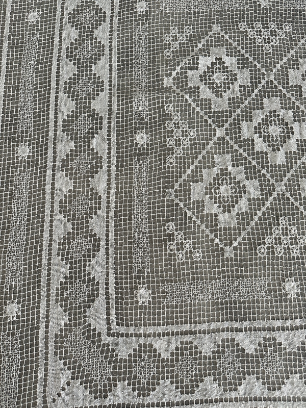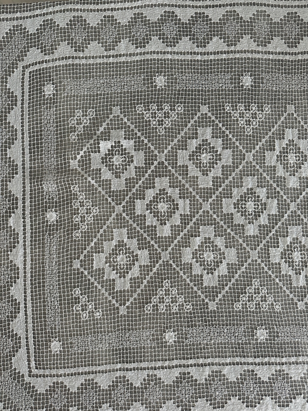 Biały niciany obrus w rozmiarze 170 x 220 cm, prostokątny.